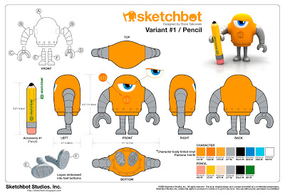 The pencil is back! I really needed to revisit the accessory issue because, really, what good is a sketchbot without his drawing implement?! I had always envisioned numerous art tools that this character would employ, and I see no reason (other than cost) to include a separate hand that is large enough to grasp the super deformed objects. This also affects the various colorways I have in mind. I'll most likely have to do an additional 3d print run, as the vinyl toy will shrink by 10%, and I really don't want the final toy to be less than 4.5". This also gives me the opportunity to finesse the grooves on the arms and legs, as the first 3d print was a bit shallow and required use of a tiny jewelers file to enhance the groove profile to a more desired finish. All of these issues start cropping up as I'm preparing the turnaround blueprints to submit to the factories for quotes. I really need to make sure there is no discrepancy in what I propose, and what I would like the final piece to look like. Lots of work involved before pulling the trigger here, and I'd rather take the time getting it right first time out of the gates as opposed to rushing it out.