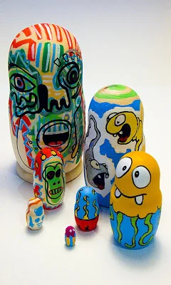 Just back from an amazing week in Seattle and I wanted to post up some photos of the collab piece I did with Fabric Lenny for his upcoming show at Low Space Gallery. He sent me a set of wooden Russian Dolls that were half-painted and left for me to finish. As you can see, I was in full "serpent/sperm" mode after using a similar motif on my DCTO piece. Be sure to catch his show this Friday, Dec. 5th, if you happen to be on the other side of the pond! Check out a plethora of Lenny's work here.