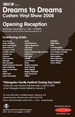 I'm putting the finishing touches on my next piece, Dacosta Bayley's DCTO (Dreams Come True Object) daruma vinyl for the first custom toy show to be held in a museum - the Japanese American National Museum in Los Angeles, CA. Opening reception will be held on Saturday, December 6th, 1-4pm, and the show will run from Dec 1st thru January 4th. I'll post a sneak sometime next week. By the looks of that artist list, this is going to be a show not to miss!